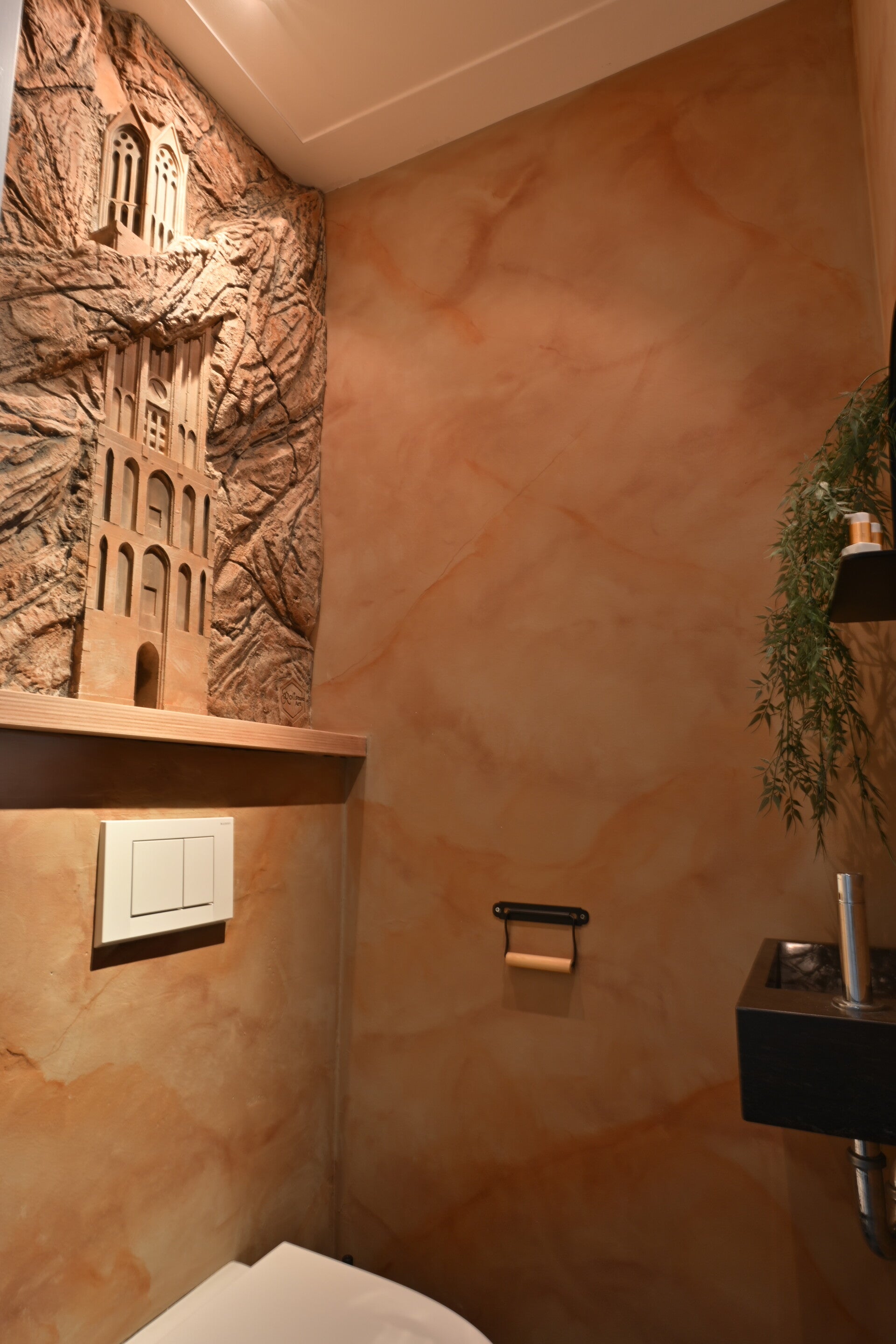 De wanden zijn afgewerkt met Cemcolori – een naadloze, watervaste en onderhoudsvriendelijke afwerking die elegantie en duurzaamheid perfect combineert.