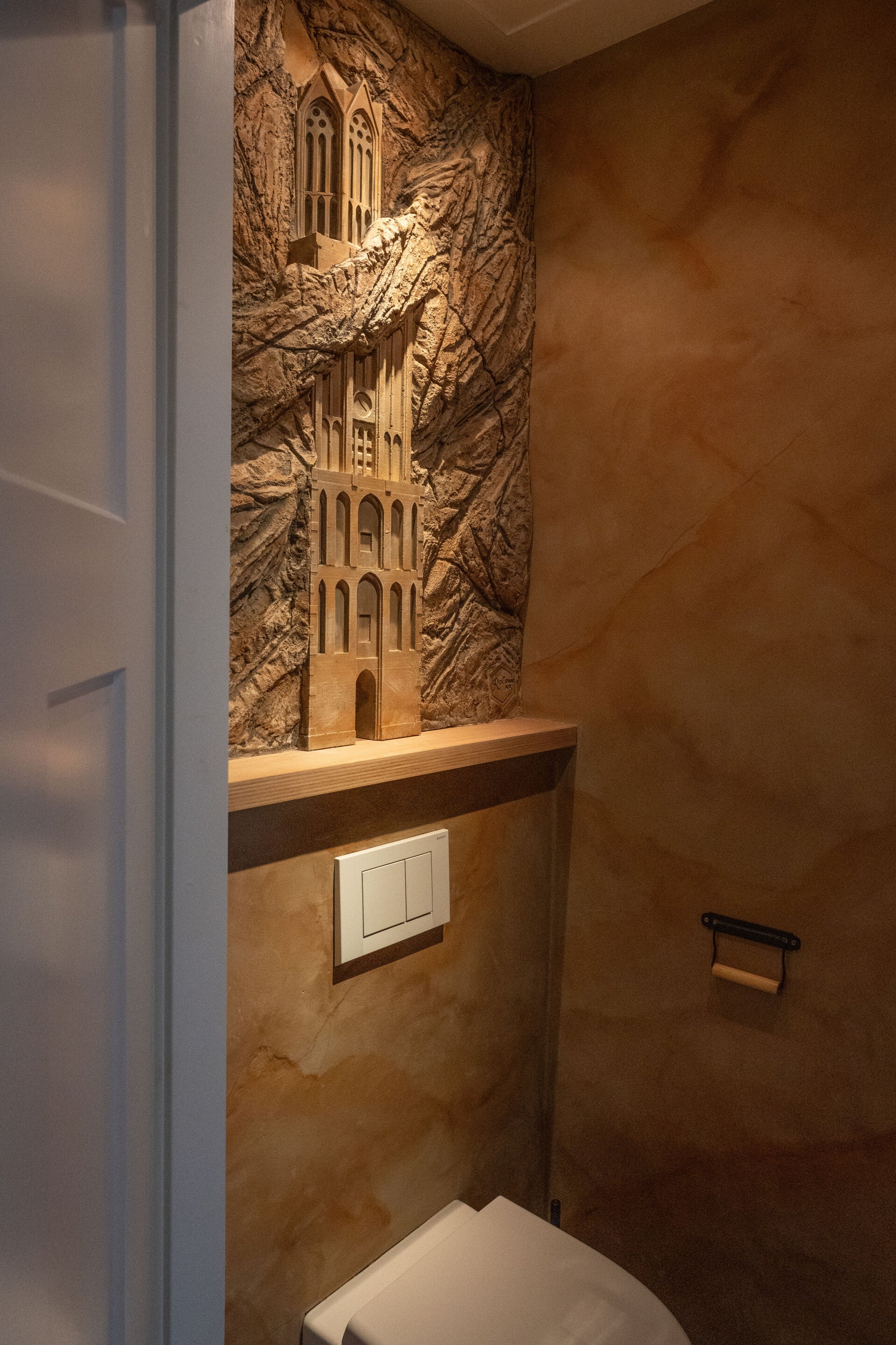 Het Roli-art toilet is een unieke combinatie van design en ambacht. De karakteristieke mock rock-achterwand met daarin de Domtoren van Utrecht vormt een echte blikvanger en geeft het toilet een artistieke uitstraling.
