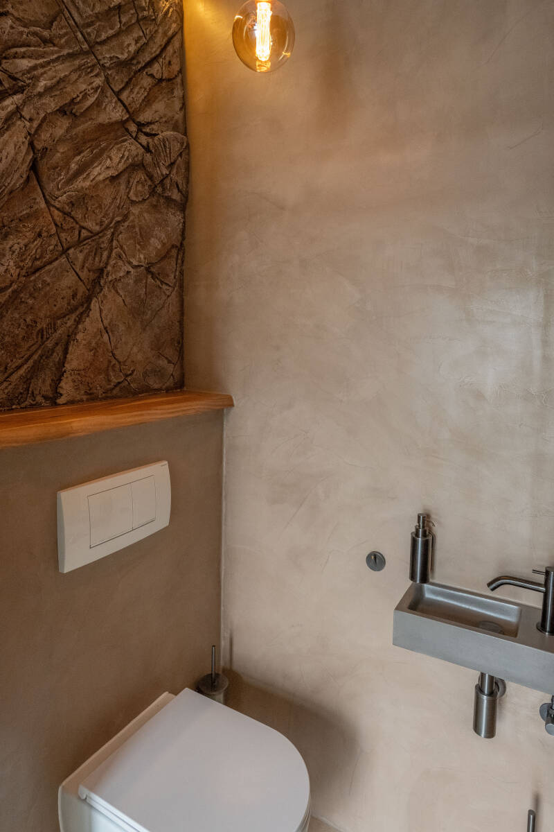Boven het toilet plaatsen we een robuuste boomstamplank. Deze is niet alleen praktisch, maar voegt ook een warme, natuurlijke sfeer toe aan het geheel.